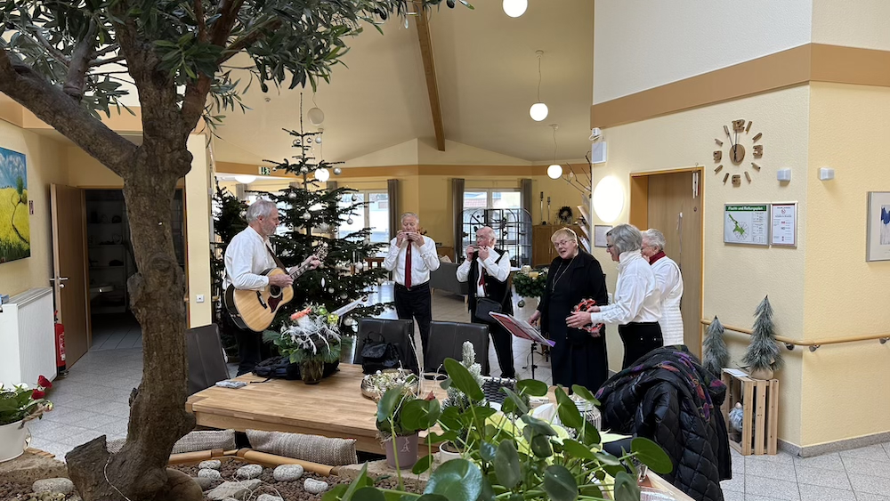 Nach einer kleinen Pause und Stärkung durch eine Tasse Kaffee fand der Besuch bei der Communio seinen Abschluss im lichtdurchfluteten Atrium des Hospizes Stella Maris mit seiner eindrucksvollen Akustik. Die Gruppe spielte deutsche und englische Weihnachtslieder, die mal meditativ, mal rhythmisch bewegt erklangen.