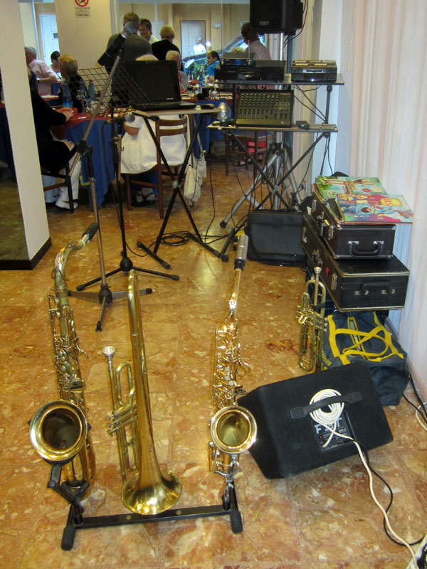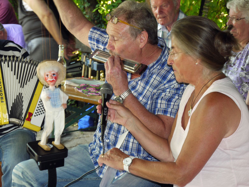 Nach ausgedehnter Mahlzeit sprudelten dann die musikalischen und komödiantischen Energien explosionsartig aus den Musikanten. Eine Attraktion folgte der anderen. Beste Stimmung, beste Laune, es wurde getanzt, gelacht und gesungen und musiziert, was das Zeug hielt.