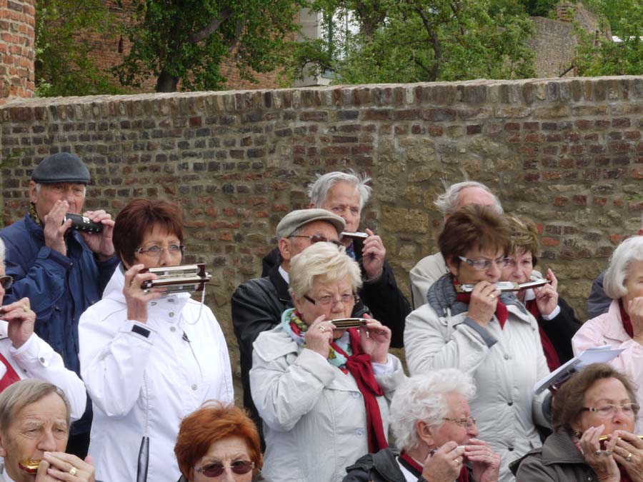 Vor mittelalterlicher Kulisse präsentierte die Mundharmonikagruppe Harmonica Sound aus Euskirchen einen bunten musikalischen Strauß. Unterstützt von Akkordeon, Gitarre und Flöte erklang ein Feuerwerk an Frühlings-, Fahrten- und Bergliedern, Wander- und Schunkelliedern.