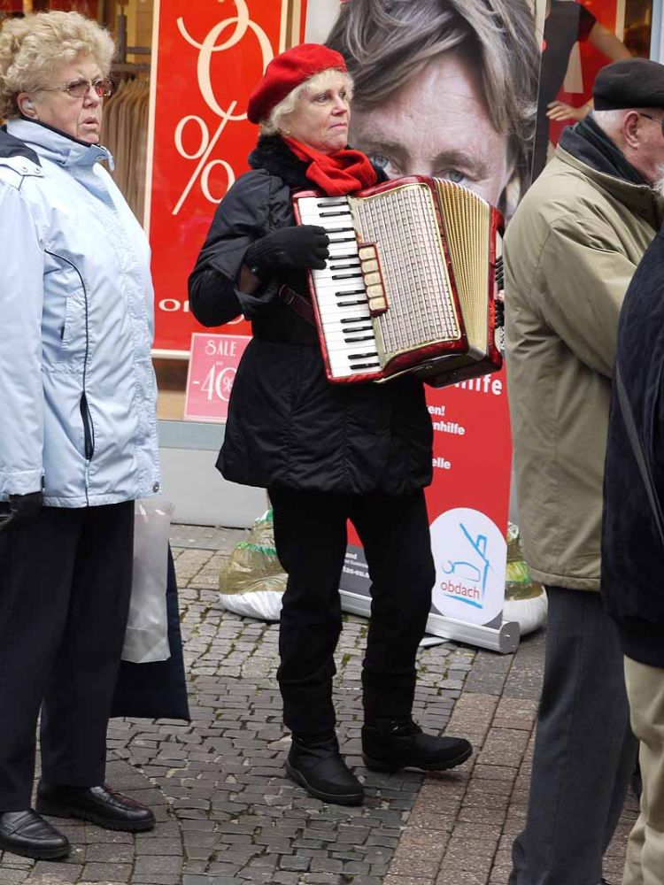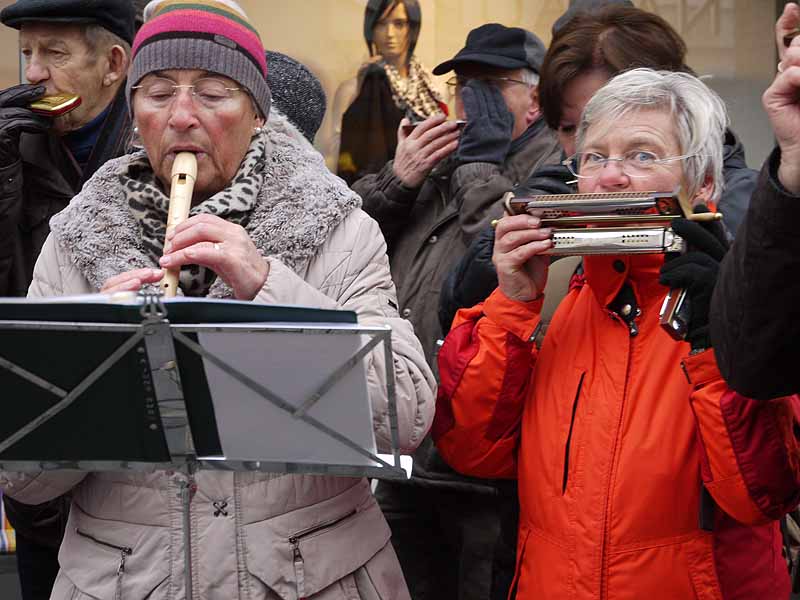Zum 11. Konzert der Mundharmonikagruppe Euskirchen - Harmonica Sound - für die von der Caritas geführte Notschlafstelle der Stadt Euskirchen traf sich erneut die große Gruppe der Musikanten in der Fußgängerzone in Euskirchen. Es war kalt und windig, aber es blieb trocken.